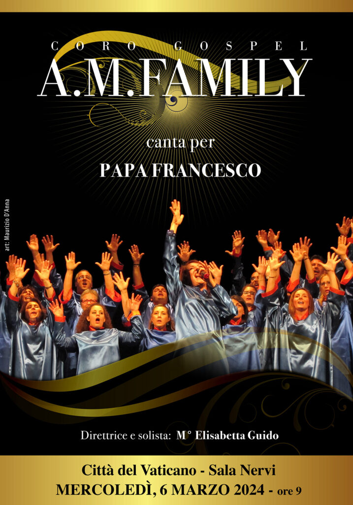 Il 6 marzo 2024, alle ore 9,00, durante l’Udienza Generale in Vaticano, Elisabetta Guido dirigerà il suo Coro A. M. Family e si esibirà come solista per S.S. Papa Francesco.